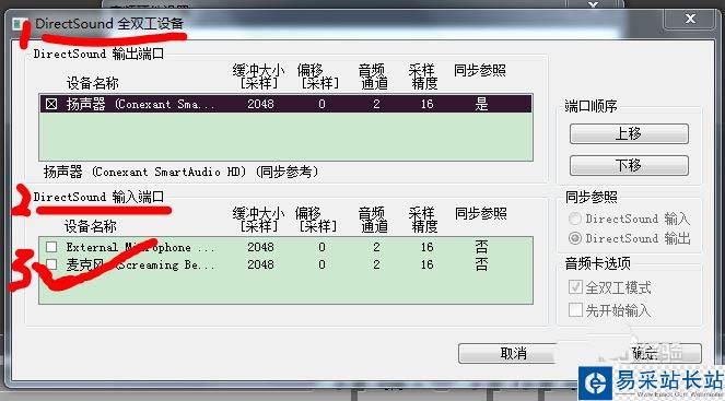 5、在“DirectSound輸入端口”的“設(shè)備名稱”中任意選擇一個,然后確定