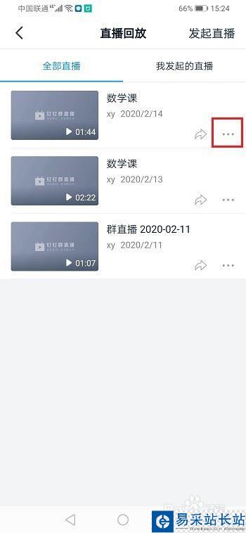 第三步在直播回放界面,選擇要查看直播時(shí)長的觀看人數(shù)的直播,點(diǎn)擊三點(diǎn)圖標(biāo),如下圖所示: