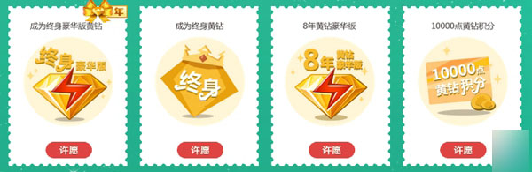 5、 用戶包月業務包括黃鉆、會員、藍鉆、綠鉆、紅鉆,開通時長本身已經為2099年12月31日的部分用戶,無法兌換至尊夢想及黃鉆貴族類別終身黃鉆,8年豪華版黃鉆的獎品。