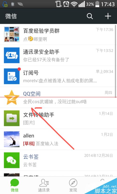 1、進入微信,可以看到QQ空間推送的消息,點擊打開。
