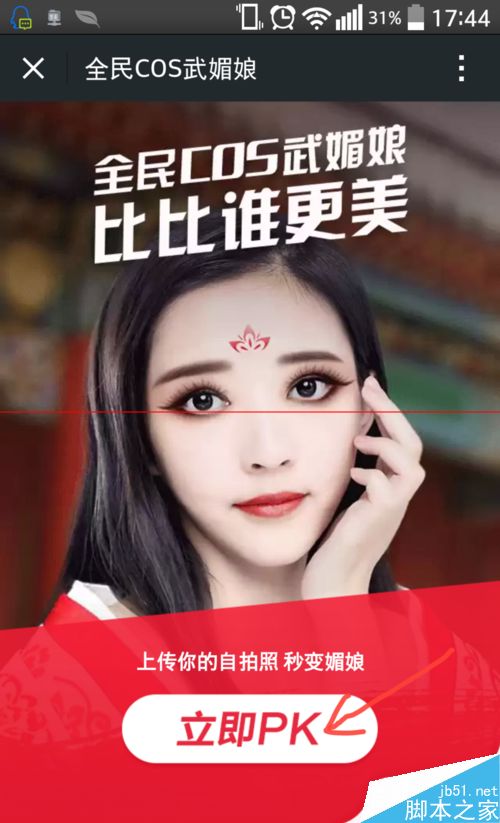 4、點擊“立即PK”進入上傳你的照片。天天P圖會將你的照片P成武媚娘樣式。