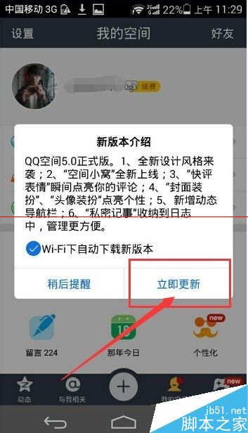 1、QQ空間5.0在之前隆重更新了。在版本里檢測(cè)版本,就可以彈框出來(lái)更新頁(yè)面了。點(diǎn)立即更新。