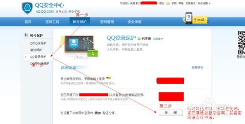 3、進入QQ安全中心(http://aq.qq.com/cn2/index),登錄后在賬號保護下點擊QQ登錄保護 ,并開通。其余見下圖。