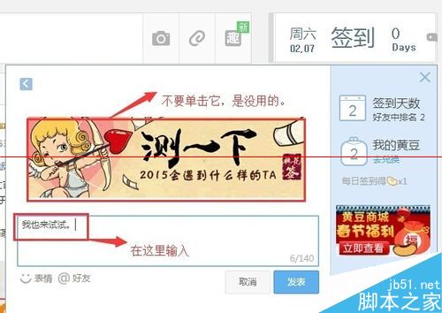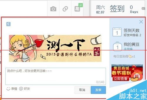 5、這次,我們在對話框輸入自己想要說的字(PS:不輸入也行哦)這時候單擊發表就出來屬于你的桃花簽了。