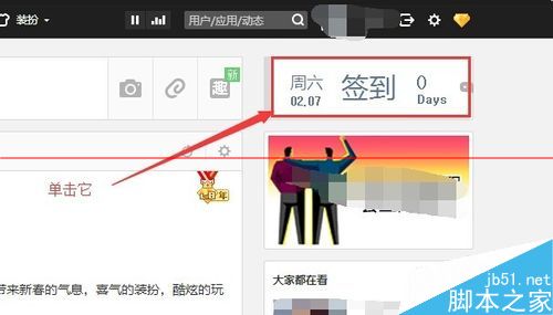 2、進入空間后,找到我們QQ空間右上角的“簽到”圖案字樣,并單擊它。