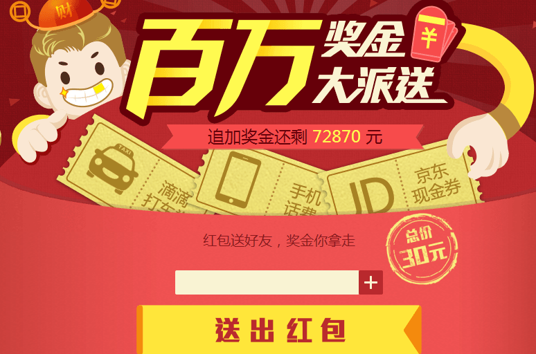 活動期間參與QQ空間舉辦的新春搶紅包活動的用戶,通過登錄QQ空間活動頁面成功送出紅包給好友,當好友打開后即可有機會贏取到京東E卡,話費,滴滴打車紅包等獎勵,活動期間送出總價值100萬元獎勵。