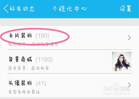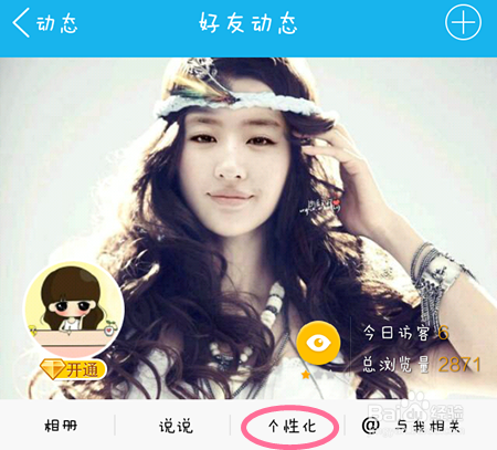 3、如果不使用這種方法你可以在你的空間主界面找到個(gè)性化,點(diǎn)擊個(gè)性化進(jìn)入個(gè)性化中心找到“卡片裝扮”。