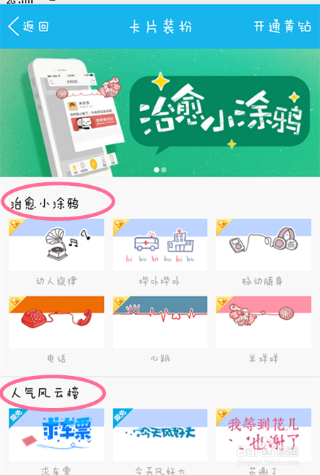 4、進(jìn)入卡片裝扮后可以看到各個(gè)類型的卡片裝扮一般有多種類型,有治愈小涂鴉,人氣風(fēng)云榜“多種類型”。