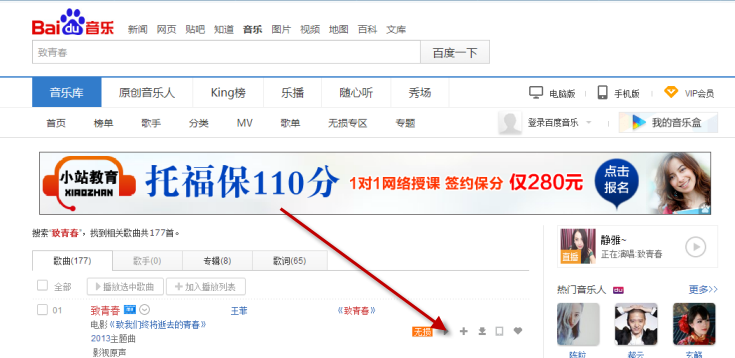 1、首先,打開百度音樂網頁,搜索你鐘愛的歌曲,這里我就搜致青春,然后點擊播放試聽一下是不是自己想要的那首歌
