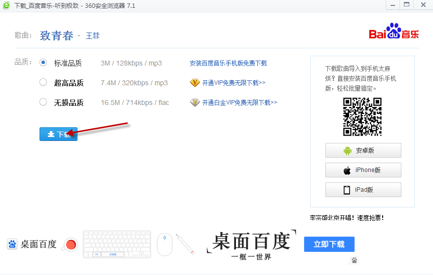 2、聽過之后,如果是你想要的歌,音質也不錯的話,就返回點擊后面的下載圖標。這時會彈出一個框,點擊來源鏈接下面的“下載”,然后又可以看到一個彈框,再點擊右上角的“下載”,又來一個彈框,把歌“下載”保存到電腦桌面上