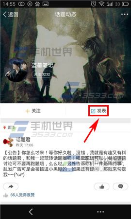 2)進入話題圈后點擊你要發表說說的話題,進入該話題,接著點擊【發表】。(如下圖)