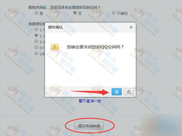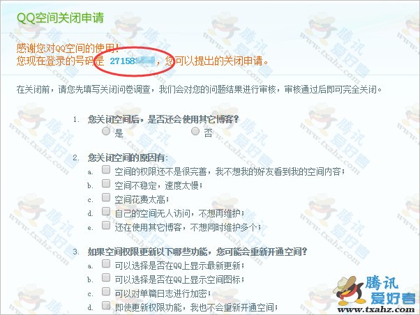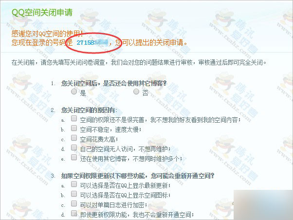 3、關閉QQ空間需要簡單選擇一些問題【這里注意看是否是自己需要關閉的QQ號】