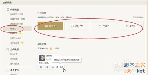4、然后在空間設(shè)置里,有一個(gè)“權(quán)限設(shè)置”的模塊,再點(diǎn)擊“防騷擾”,點(diǎn)擊之后,就可以對評論的回復(fù)功能、留言板留言進(jìn)行設(shè)置了。選擇所有好友,就是所有好友都可以評論留言,也可以選擇僅QQ好友或者自己可以。