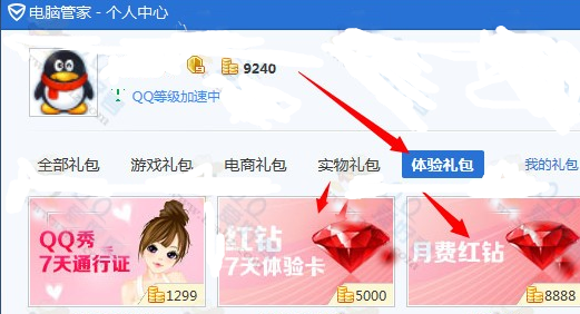 2、繼續(xù)點(diǎn)擊“體驗(yàn)禮包”,就可以看到用安全金幣兌換QQ紅鉆了。如下圖: