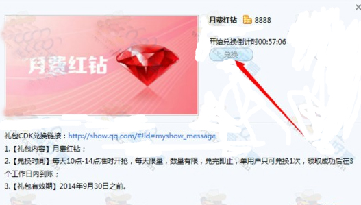 3、可以兌換紅鉆7天和月費(fèi)紅鉆,如果金幣夠當(dāng)然是月費(fèi)的了。每天10點(diǎn)-14點(diǎn)開搶。如下圖: