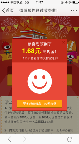 3、參加活動時請確保支付寶能夠正常收款,如果發放過節費時由于支付寶狀態異常(如未實名認證等)以及解除支付寶與微博賬號的綁定等原因,導致不能正常收款,將無法得到現金獎勵;
