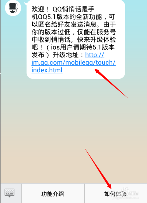 第六步:接下來點擊對話框下面的如何體驗。這個時候就會有系統消息發過來,看看是如何升級激活qq悄悄話功能的介紹。