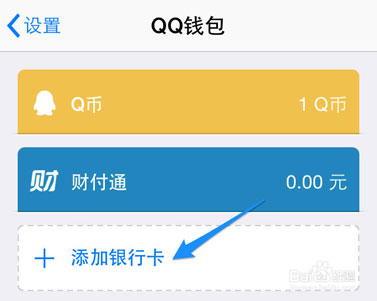 在QQ錢包中可以看到我們當前的 Q幣,以及財富通余額,若想要在QQ中添加銀行卡,表點擊“添加銀行卡”一欄,如圖所示