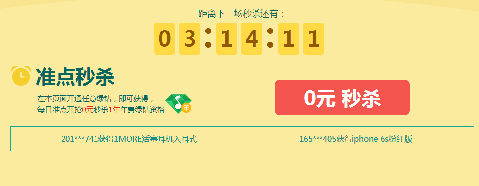 在本頁面開通任意綠鉆,即可獲得,每日準點開搶0元秒殺1年年費綠鉆資格。