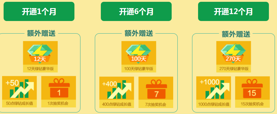3、活動期間,開通1個月綠鉆可額外獲得12天綠鉆豪華版、50點綠鉆成長值及1次抽獎機會;一次性開通6個月綠鉆可額外獲得100天綠鉆豪華版、400點綠鉆成長值及7次抽獎機會;一次性開通12個月綠鉆可額外獲得270天綠鉆豪華版、1000點綠鉆成長值及15次抽獎機會。(以上綠鉆豪華版均為升級包)