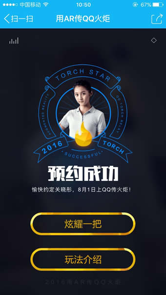 此次QQ火炬傳遞共設有6站,分別是雅典、北京、首爾、悉尼、巴黎、里約,每個城市對應一張AR識別圖和AR動畫。用戶領到火種之后,默認在雅典,傳遞人數到達一定數量之后,可以到達下一站。值得注意的是,QQ此次火炬傳遞的識別圖都帶有LBS 信息,所以用戶只能“面對面”進行傳遞,掃描截圖則無效。