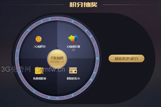 2、積分抽獎,所有騰訊游戲玩家均可參與,每次抽獎消耗9心悅積分,每次刷新獎池消耗5心悅積分。心悅成長值≥10000用戶,每月可享0積分抽獎1次。