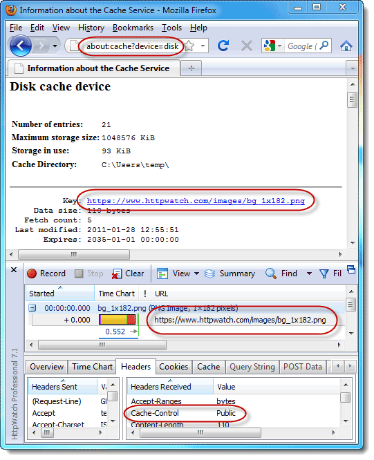 Firefox默認只在內存中緩存HTTPS。但是,只要頭命令中有Cache-Control: Public,緩存就會被寫到硬盤上。下面的圖片顯示,Firefox的硬盤緩存中有HTTPS內容,頭命令正是Cache-Control:Public。