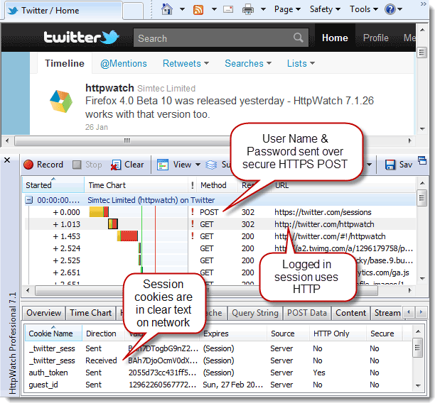 也就是說,這些cookie是在HTTPS環境下建立的,但是卻在HTTP環境下傳輸。如果有人劫持到這些cookie,那他就能以你的身份在Twitter上發言了。