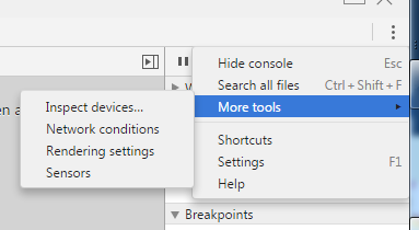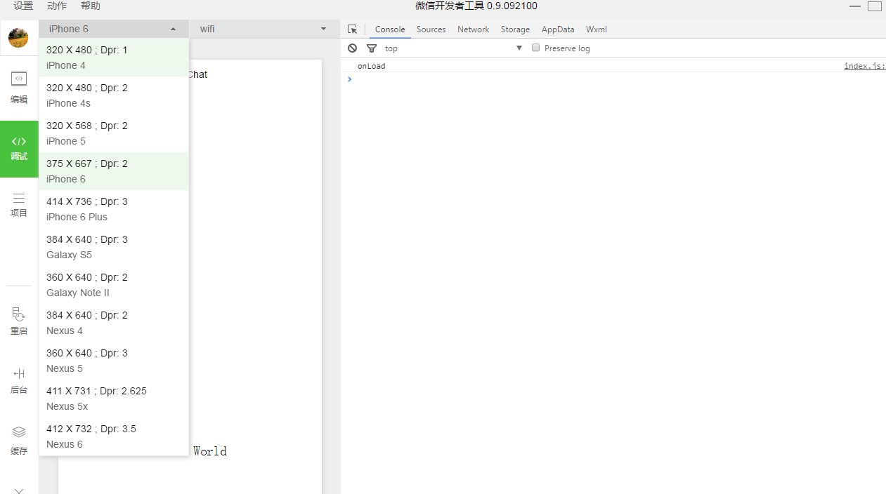 點(diǎn)擊調(diào)試按鈕,左上有可以選擇調(diào)試的移動(dòng)終端,里面可以選擇蘋(píng)果,三星及其他不同分辨率設(shè)備。設(shè)備右邊有選擇網(wǎng)絡(luò)的按鈕,可以選擇wifi,2G,3G,4G網(wǎng)絡(luò)。在右邊的窗口,有console可以查看控制臺(tái)打印的信息,以及網(wǎng)絡(luò),存儲(chǔ)信息等。