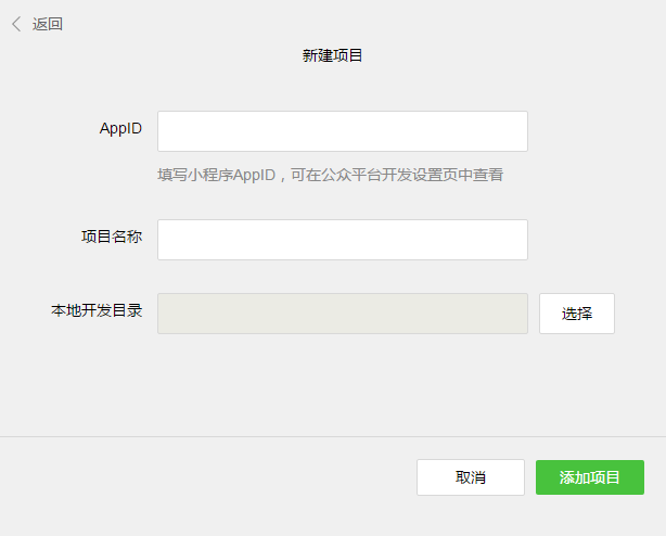 因?yàn)槲覀儧](méi)有內(nèi)測(cè)賬號(hào),這個(gè)appid可以隨便輸入,項(xiàng)目名稱,及開(kāi)發(fā)目錄就隨便寫(xiě)了。