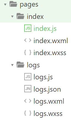 可以看到,在每個(gè)頁面中,也有類似前邊兒我們所說的app.js,app.json等文件,下面我們就來看看它們具體是什么。