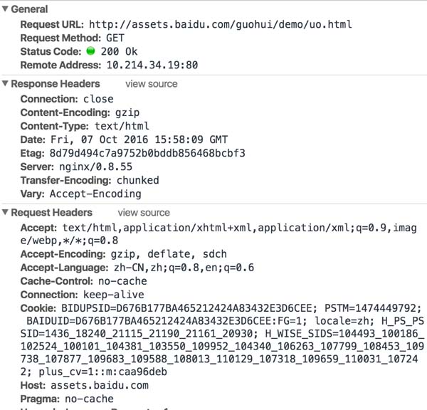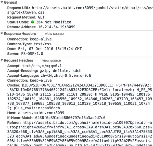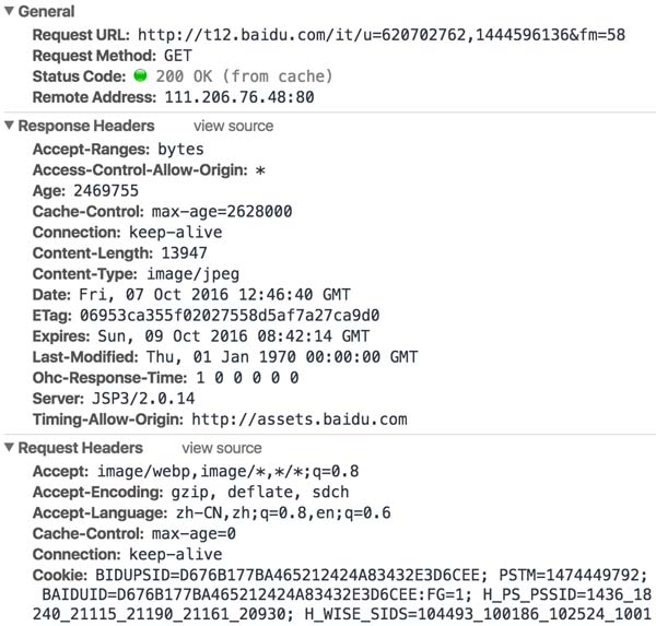 可以看到圖片的請求頭這次沒有If-None-Match參數,而是帶上了Cache-Control:max-age=0,狀態碼是200 from cache,說明這次請求沒有訪問服務器,而直接是cache返回的響應。