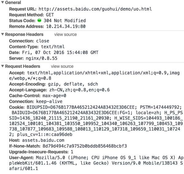 如上是火狐下的firebug,可以看到html頁面請求返回304,并且請求頭中帶上了If-None-Match參數,這和chrome一樣。