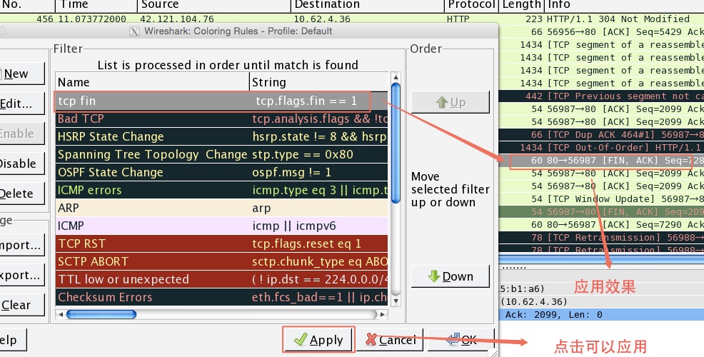 注意:wireshark在應用規則的時候,是按自上而下的順序去應用規則。因此剛添加的規則會優先應用。如果你想調整順序,可以選中要調整順序的規則,然后點擊右邊的“UP” 或則 “Down” 按鈕。