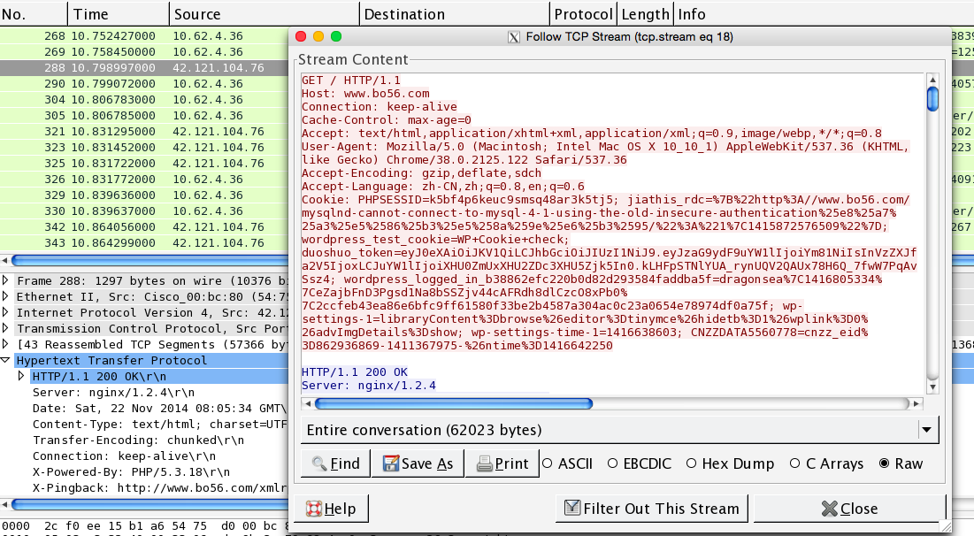 在這個窗口中除了能夠看到這些原始數據,你還可以在文本間進行搜索,將其保存成一個文件、打印,或者以ASCII碼、EBCDIC、十六進制或者C數組的格式去查看。這些選項都可以在跟蹤TCP流窗口的下面找到。
