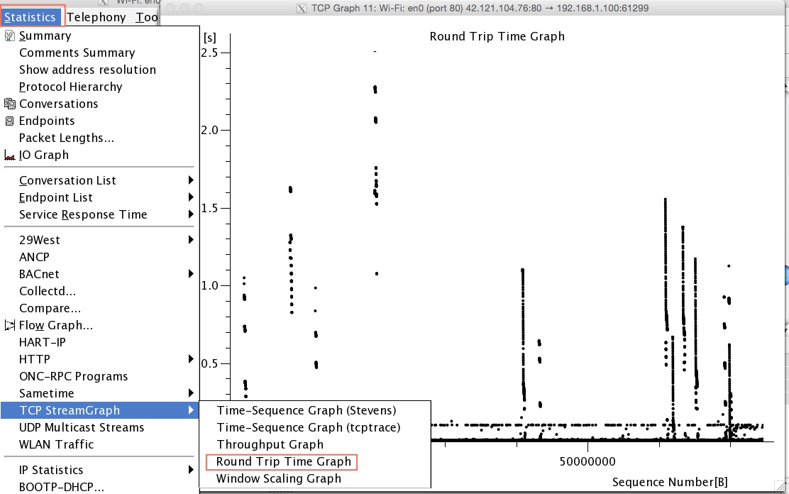 wireshark還有一個功能就是可以對網絡傳輸中的雙向時間進行繪圖。