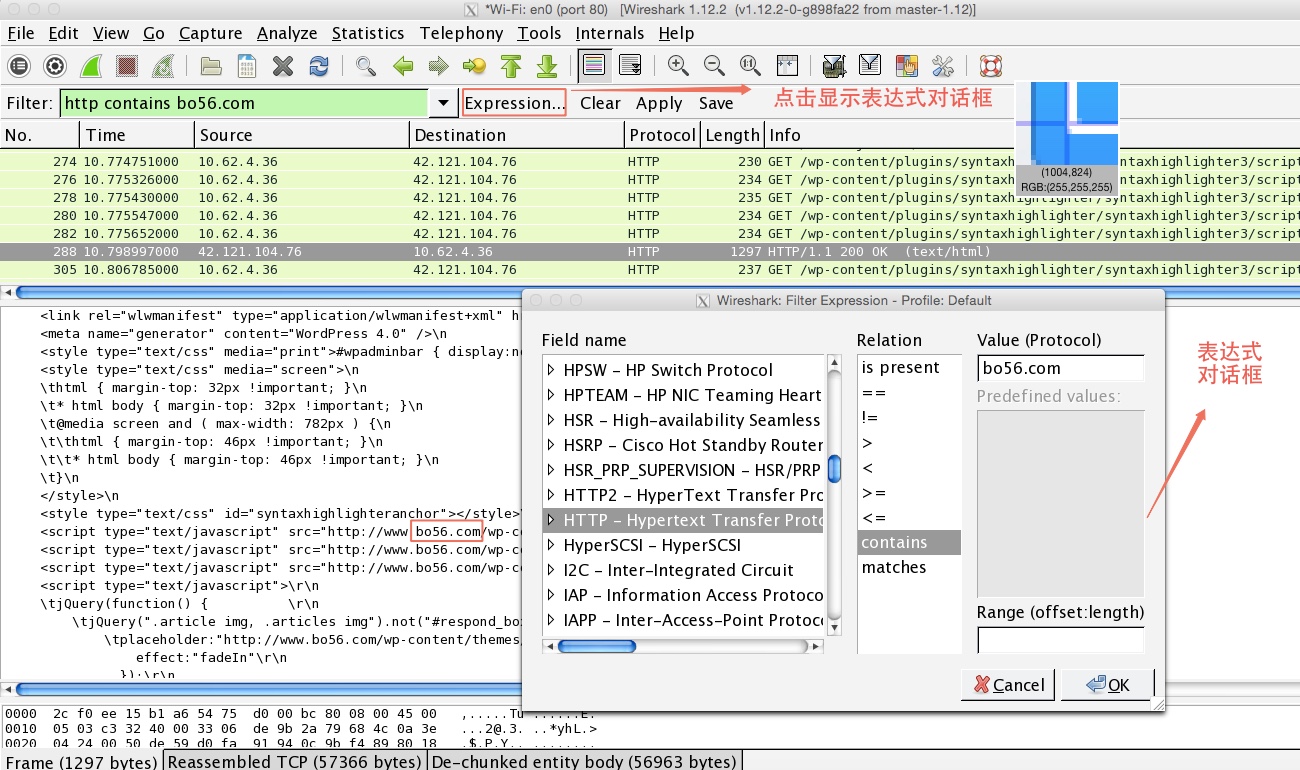 中間為協議域與條件值之間的關系。過濾器表達式對于初學者很有用。如上圖,我們創建的表達式的作用是,只顯示http協議包中包含關鍵詞“bo56.com”的所有數據包。