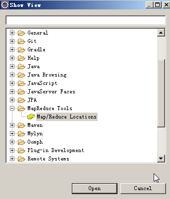 在其中選中Map/ReduceLocations,點擊Open后將成功添加Map/ReduceLocations窗口,點擊右側的小象圖標創建New Hadoop Location,如下圖: