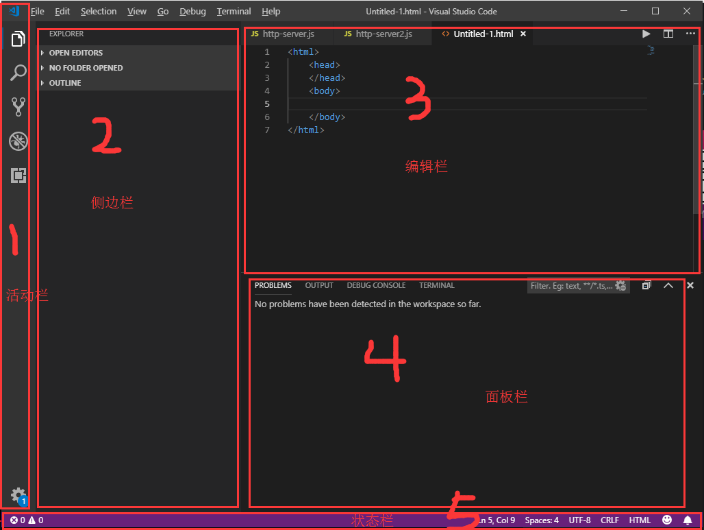 Vscode界面介紹(主要分為5個區域,分別是活動欄,側邊欄,編輯欄,面板欄,狀態欄)