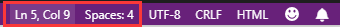 ⑥:需要注意的為下圖紅框所示,分別表示鼠標光標所在位置和tab縮進字符,這里為縮進4個字符