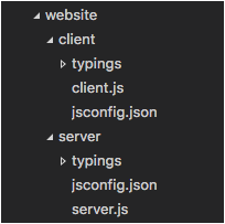 在更復雜的項目中,您可能在工作區中定義了多個 jsconfig.json 文件。 您希望這樣做,這樣一個項目中的代碼就不會被建議作為 IntelliSense 在另一個項目中進行編碼。 下面是一個帶有客戶端和服務器文件夾的項目,展示了兩個獨立的 JavaScript 項目。