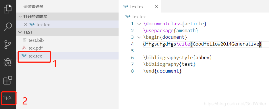 做好上述的步驟,那么你就配置好了LaTex,此時(shí),你再重啟VSCode即可編譯LaTex了。新建一個(gè).tex后綴的文件或者打開(kāi)一個(gè).tex結(jié)尾的文件,如下圖所示,就會(huì)出現(xiàn)TEX這個(gè)圖標(biāo)