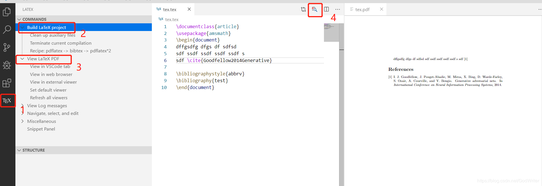 打開(kāi)TEX文件當(dāng)你編輯好一段LaTex的內(nèi)容后,該如何編譯呢,如下圖所示,根據(jù)步驟來(lái)即可。第三步View LaTex PDF,就會(huì)將PDF文件打印出來(lái),再點(diǎn)擊第四步的按鈕,pdf就顯示了