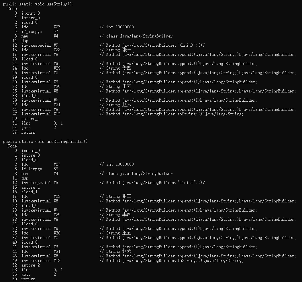 /** * 多次循環拼接成一個字符串 用 String */ public static void useStringSpliceOneStr (){ String str = ""; for (int i = 0; i < CYCLE_NUM_LOWER; i++) { str += str1 + str2 + str3 + str4 + i; } } /** * 多次循環拼接成一個字符串 用 StringBuilder */ public static void useStringBuilderSpliceOneStr(){ StringBuilder sb = new StringBuilder(); for (int i = 0; i < CYCLE_NUM_LOWER; i++) { sb.append(str1).append(str2).append(str3).append(str4).append(i); } }