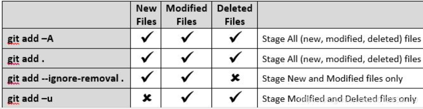 git initecho Change me > change-meecho Delete me > delete-megit add change-me delete-megit commit -m initial echo OK >> change-merm delete-meecho Add me > add-me git status# Changed but not updated:# modified: change-me# deleted: delete-me# Untracked files:# add-me git add .git status # Changes to be committed:# new file: add-me# modified: change-me# Changed but not updated:# deleted: delete-me git reset git add -ugit status # Changes to be committed:# modified: change-me# deleted: delete-me# Untracked files:# add-me git reset git add -Agit status # Changes to be committed:# new file: add-me# modified: change-me# deleted: delete-me