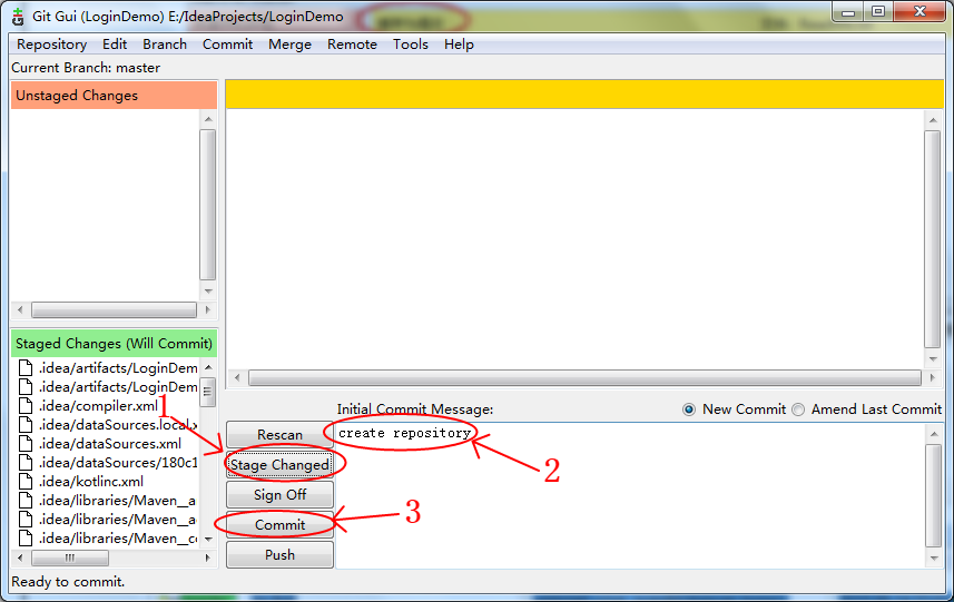 在Git Gui中,如果Unstaged Changes(未緩存的改動)中包含文件,則先點擊Stage Changed,將未緩存的改動加入緩存,再點擊Commit;否則需要先點擊Rescan掃描項目中進行過改動的文件。注:提交描述必須要填寫,不然無法提交。