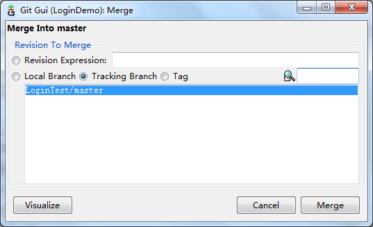 從遠程fetch后,選擇Git Gui的Merge->Local Merge進行合并,選擇Tracking Branch。