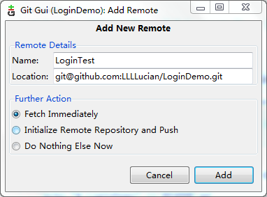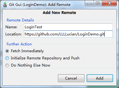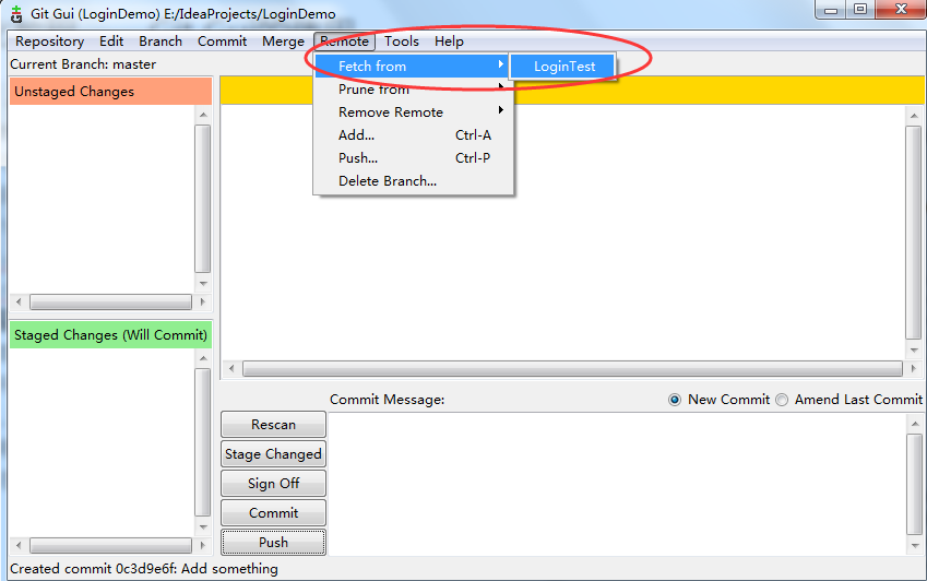 設(shè)想多人參與項目開發(fā),每個人都只push到遠程,完全不顧其他成員的進度,這樣的開發(fā)模式無疑是有問題的。我們最好的做法是,每次push到遠程的時候,先從遠程把目前進度fetch下來,在和自己目前項目進度merge后,再將它push到遠程。打開Git Gui,在菜單欄中選擇Remote->Fetch from->LoginTest,便可以從遠程服務(wù)器更新到本地,但是尚未與自己當前項目合并。