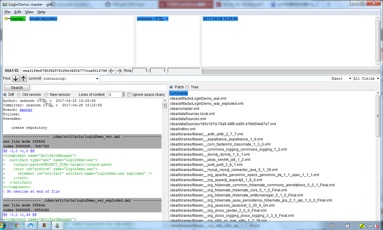 提交成功后,我們可以在Repository->Visualize All Branches History中看到我們提交的歷史記錄(這是提交到本地而不是提交到遠程服務(wù)器)。至此,本地版本庫就創(chuàng)建成功了。
