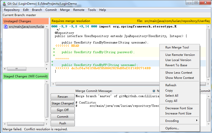 如果本地有一個方法名叫findUser,而遠程服務(wù)器中該方法的名字改變了,例如變成了findPassword,則合并遇到?jīng)_突,可以右鍵空白部分選擇保留本地版本或遠程版本進行合并(圖中綠色的代碼表示沖突部分)。